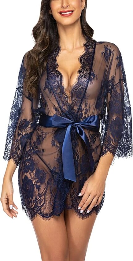 Women’s Lace Kimono Robe Babydoll Lingerie Mesh Nightgown Navy Blue