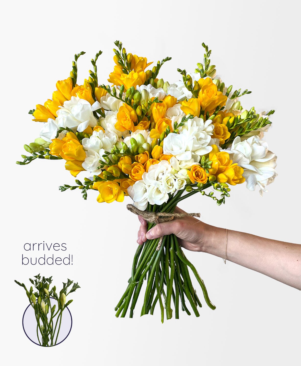 40 stems (2-4 blooms per stem!) of double-bloom Ontario grown white and yellow freesia. The simple and elegant beauty of the freesia flower arrives budded and blooms beautifully while giving off a light fragrance.