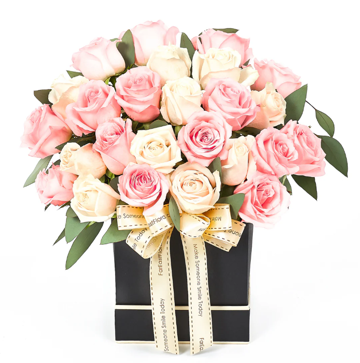 Spring a delightful floral surprise on your friend, colleague or a special loved one today! This beautiful arrangement of blush pink and cream roses in a classy black bloombox will definitely bring a smile to her face. Reliable same/next-day delivery options available.