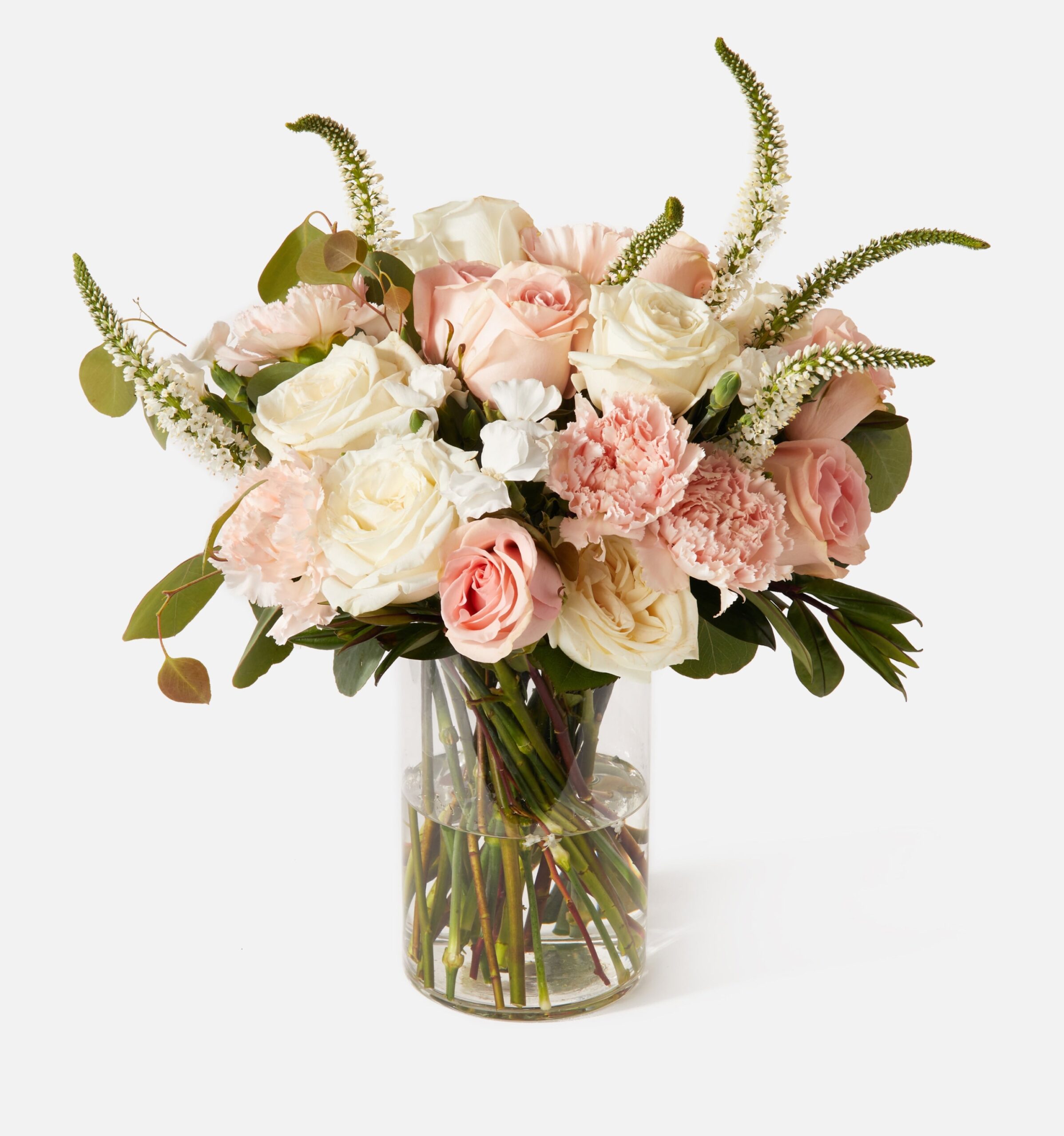 Discover the art of understated affection with this blend of delicate pink and creamy white roses. We like to think it offers a beautifully subtle way to send your love. Perfect for conveying deep emotions with a soft, elegant touch. We’re committed to delivering bouquets that match our photos. Occasionally, we might replace certain flowers due to seasonal availability, but your bouquet’s overall appearance will remain unchanged.