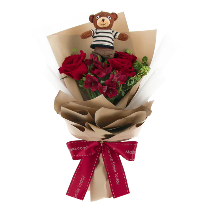 Let someone know that they are beary important to you by surprising them with a bouquet of classic, elegant roses paired with a little brown bear keychain nestled in between!