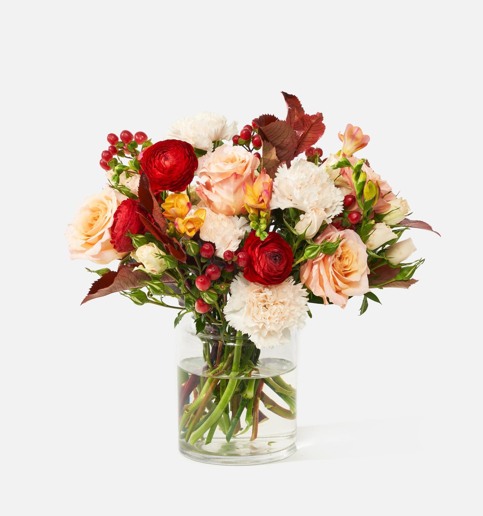Deep reds. Soft whites. Serious impact. This low-profile centerpiece, arranged in a sleek glass vase, is ready to grace any table with its refined, romantic presence. Designed for dinners, gatherings, or any moment that calls for something a little more elevated, this arrangement is bold without being loud—just the right balance of richness and restraint.